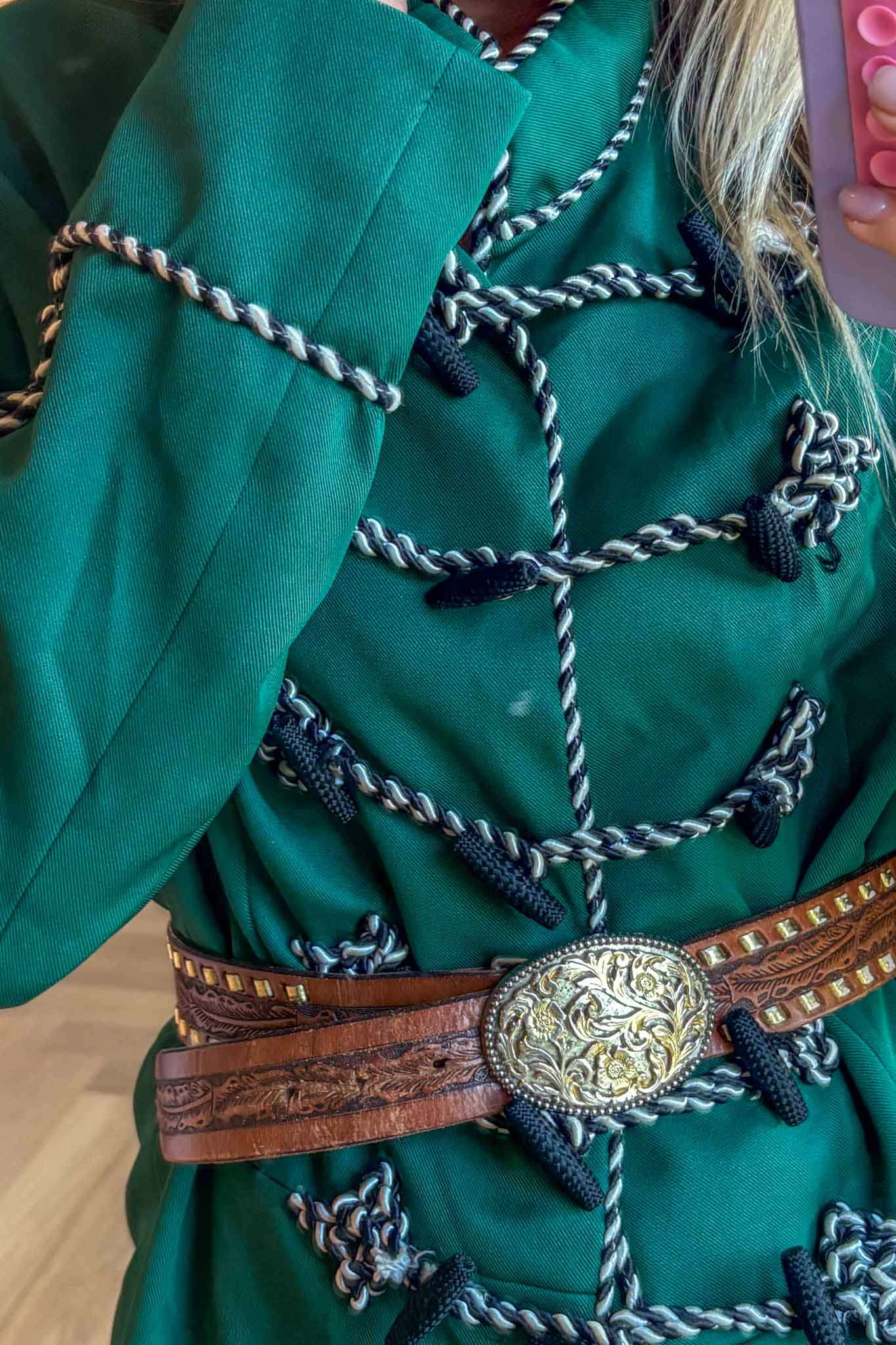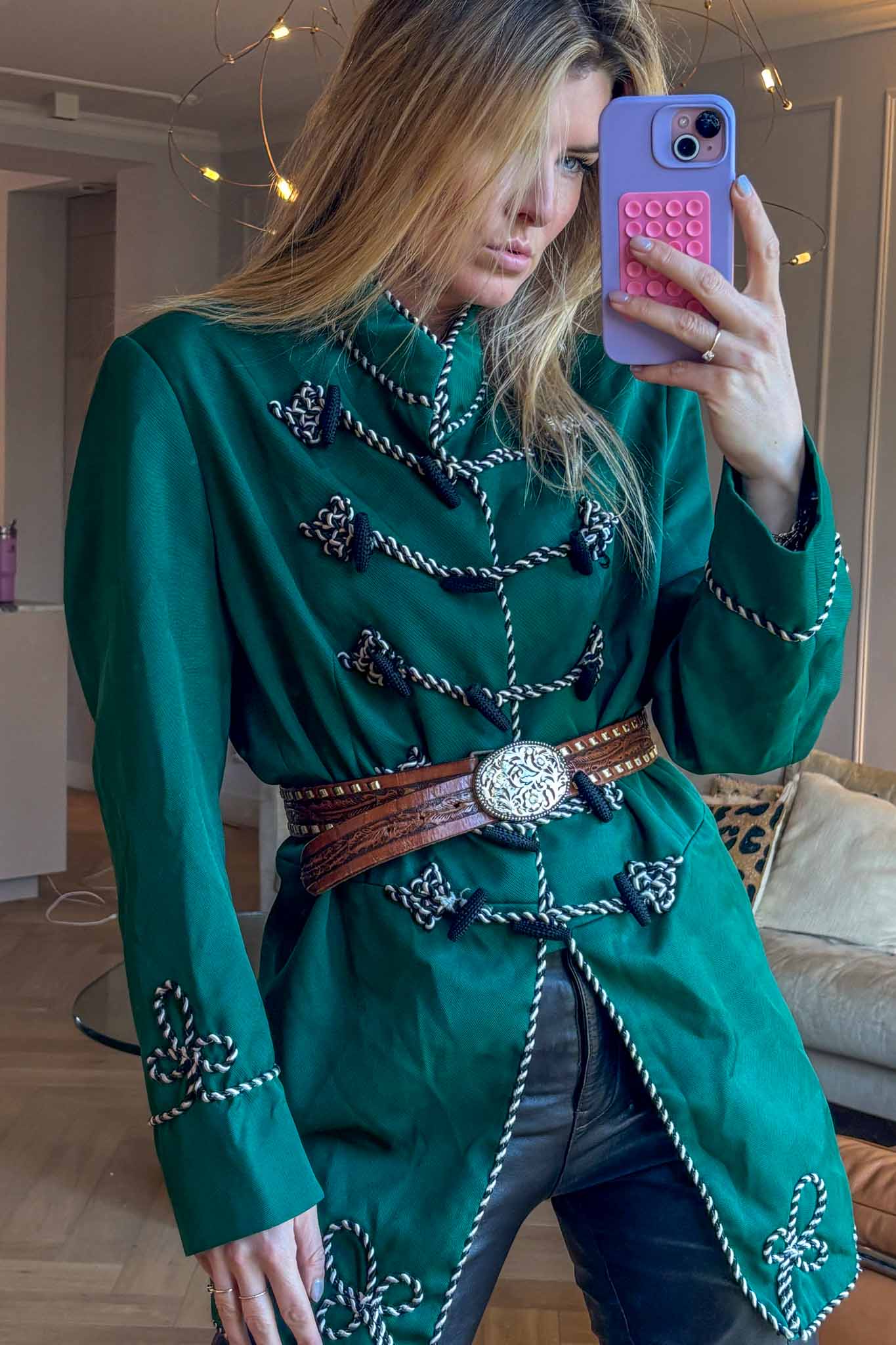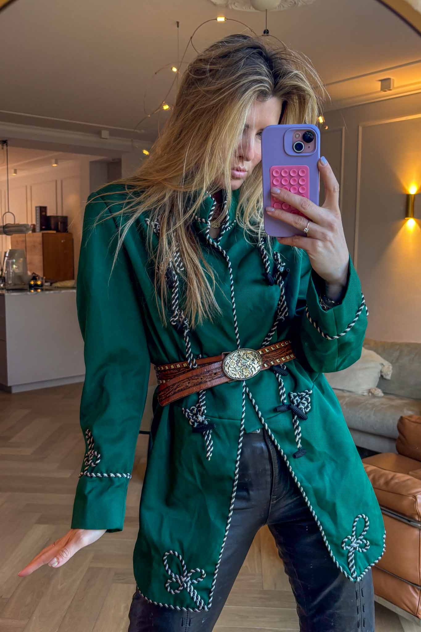 Western in green military trendy jacket is a green cotton military jacket elevated with subtle western-inspired details that give it edge without overdoing it. Structured yet relaxed, this piece balances function and style effortlessly — the kind of jacket that works year after year.